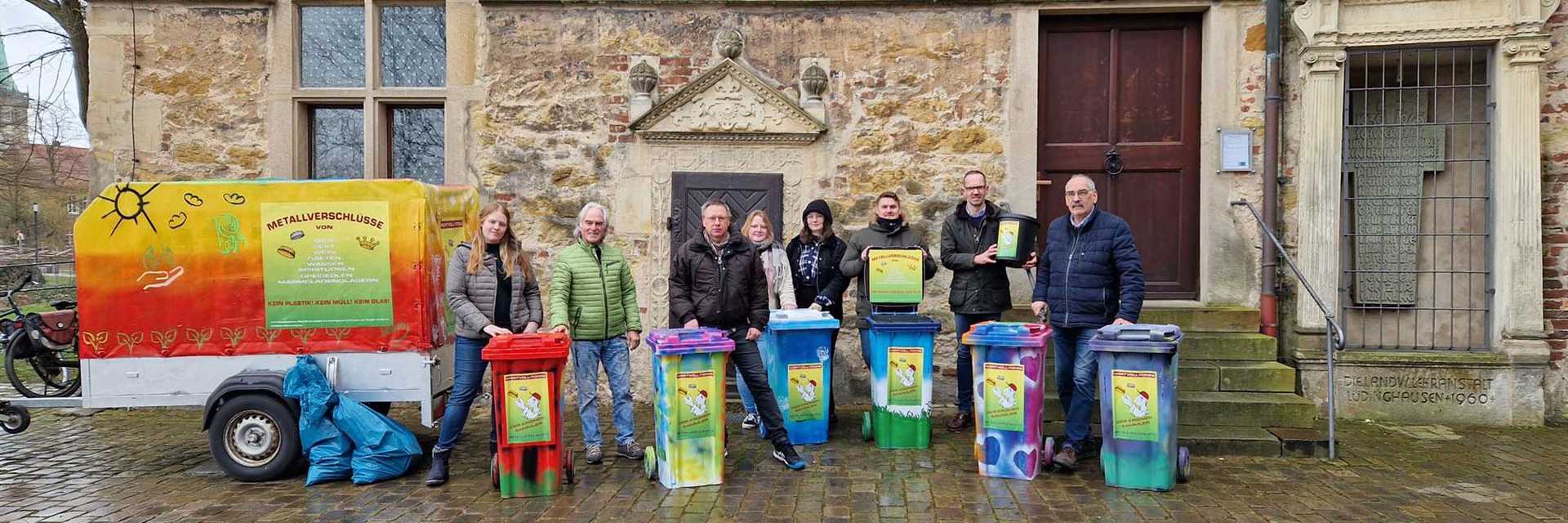 Eigene bunte WERTVOLL-Tonnen, gestaltet und besprayt von „JUKI e.V.“ (Jugend und Kirche) Lüdinghausen, die auch Paul`s Werbeanhänger bunt gestalteten, entstanden mit finanzieller Unterstützung der Bürgerstiftung. Der bekannte Künstler Alfred Gockel „verkünstelte“ das Ganze. …und erschuf den Kronen-Sammler zum Sammeln von Metallverschlüssen.